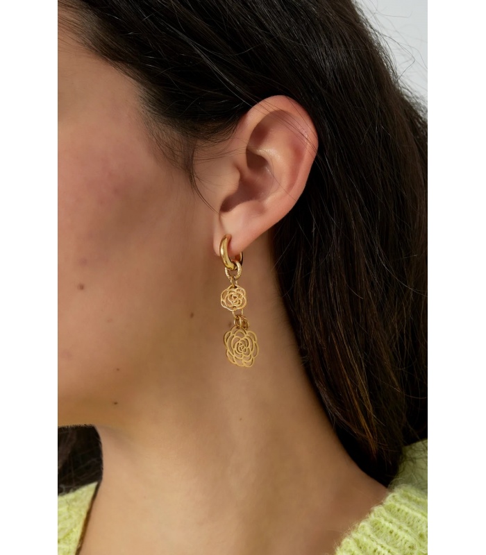 De strakke oorringen contrasteren prachtig met de gedetailleerde bloemvormige hangers. Deze combinatie maakt de oorbellen ideaal voor wie houdt van sieraden met karakter. Combineer ze met andere gouden sieraden voor een stijlvolle, tijdloze look.