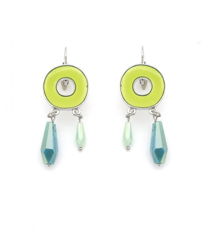 Oorbellen die je look direct laten stralen? Deze oorbel combineert een ronde limekleurige hanger met zilverkleurige details en facet geslepen kristallen. De subtiele beweging geeft een speels effect. Perfect als statement oorbellen bij een moderne outfit.
