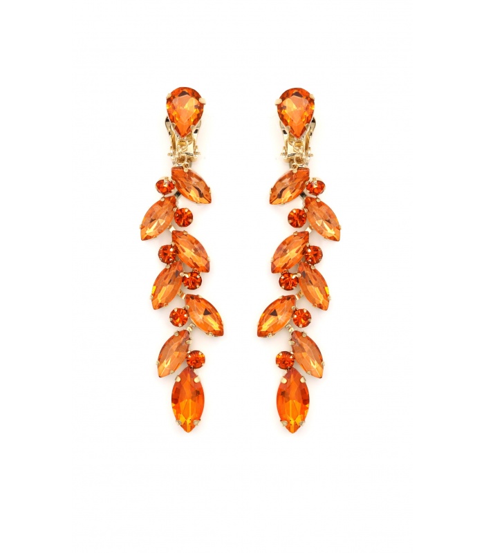 Deze oorclips zijn opvallend en elegant vormgegeven met oranje, bladvormige kristallen die in een vloeiende verticale lijn zijn geplaatst. De stenen hebben een marquise slijpvorm, wat zorgt voor een luxe uitstraling en een schitterend lichtspel bij beweging. Tussen de grotere kristallen zijn kleinere ronde oranje steentjes verwerkt voor extra glans en diepte.